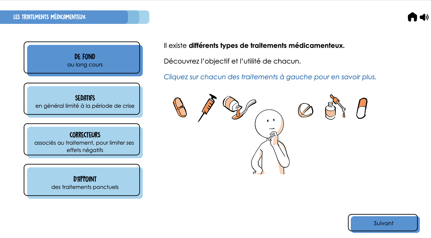 - un schéma interactif qui récapitule les différents types de traitements médicamenteux existants pour réduire les symptômes des troubles et prévenir leur réapparition, ainsi qu’une vidéo pédagogique pour présenter leur mode d’action dans l’organisme ;